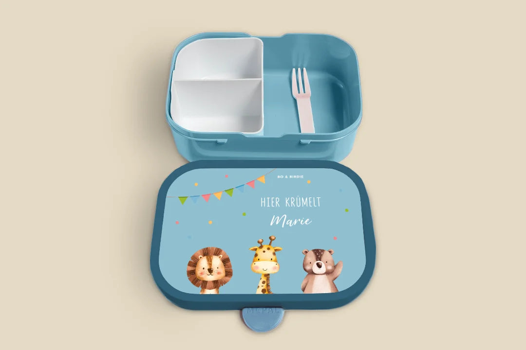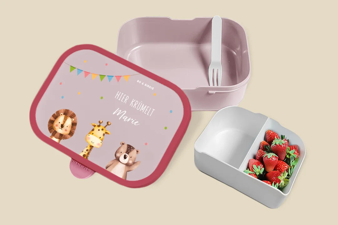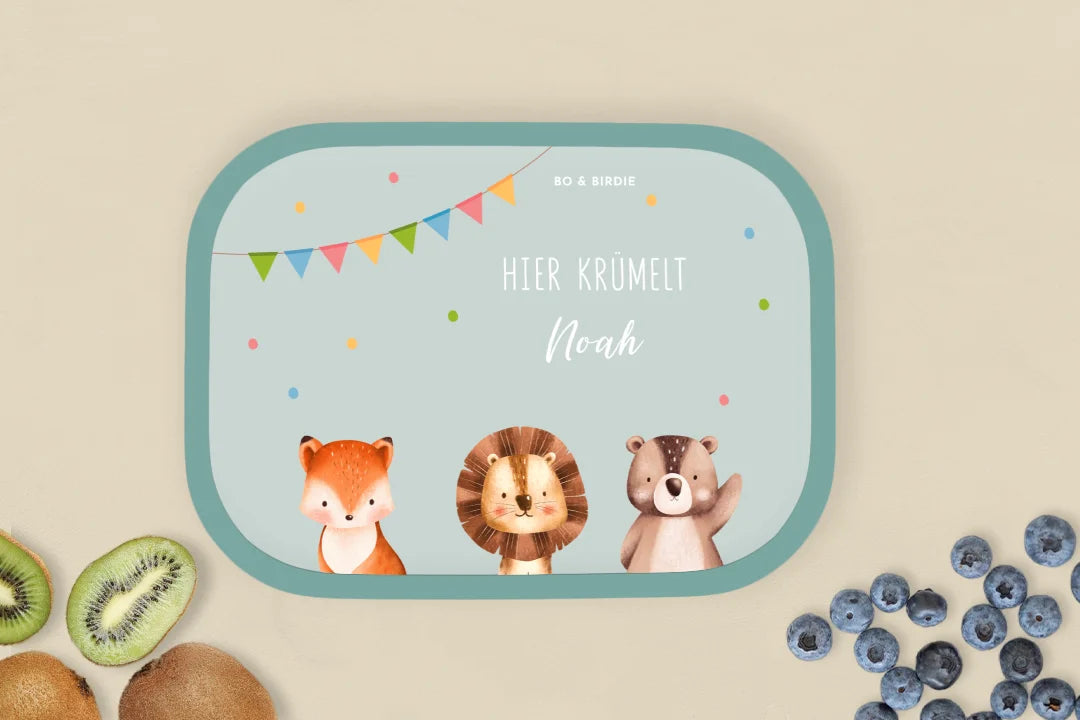 Personalisierte Brotdose mit süßen Tieren im Scandi-Look