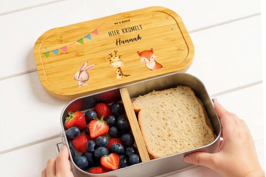 Nachhaltige Lunchbox mit süßen Tieren und Namen – perfekt für kleine Krümelmonster.