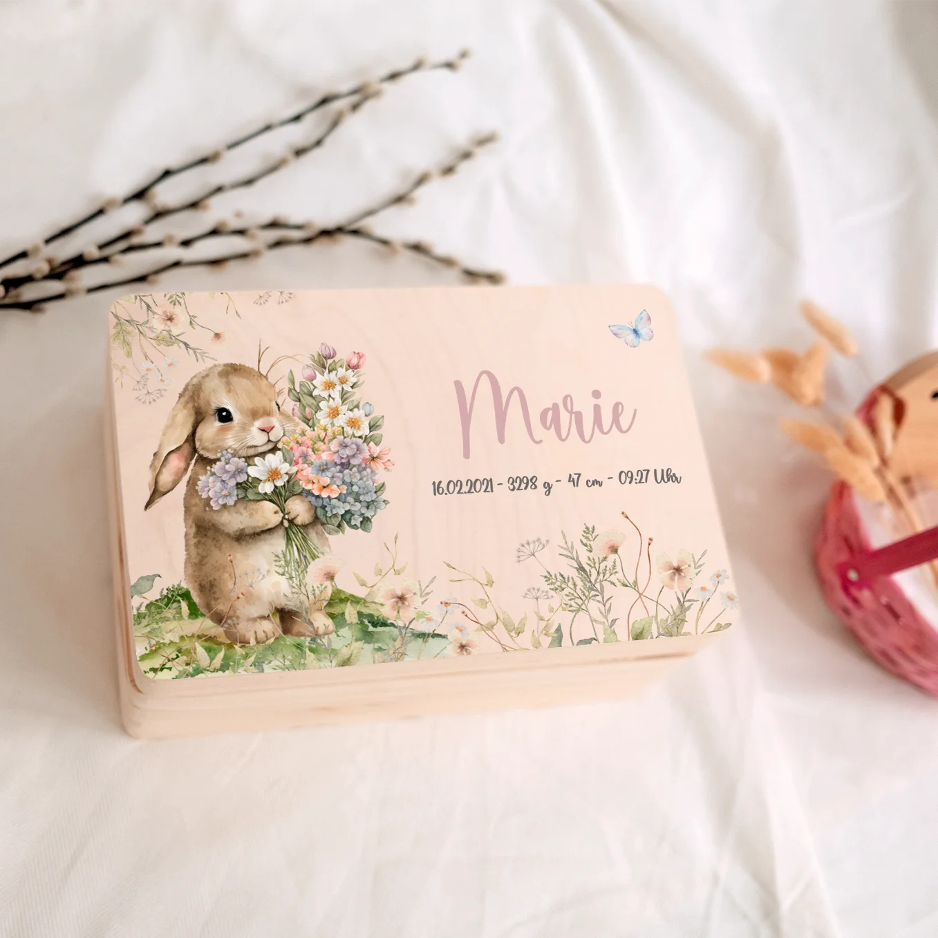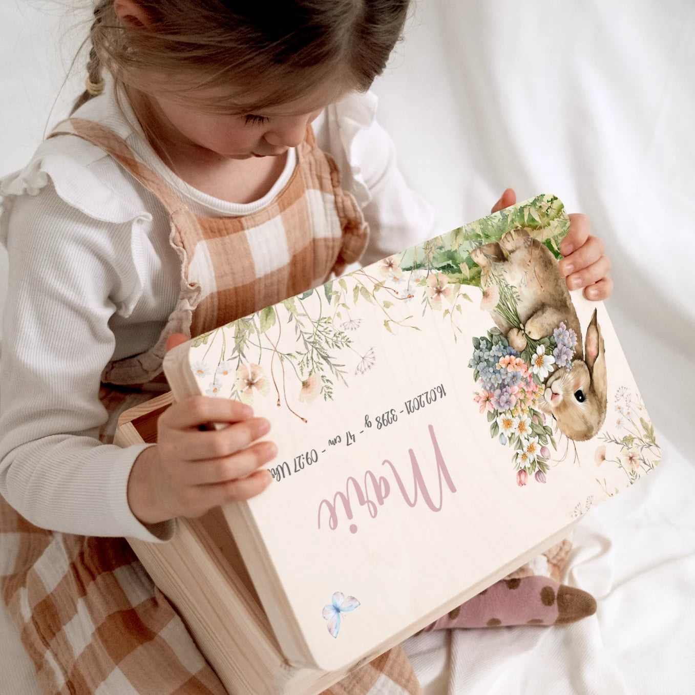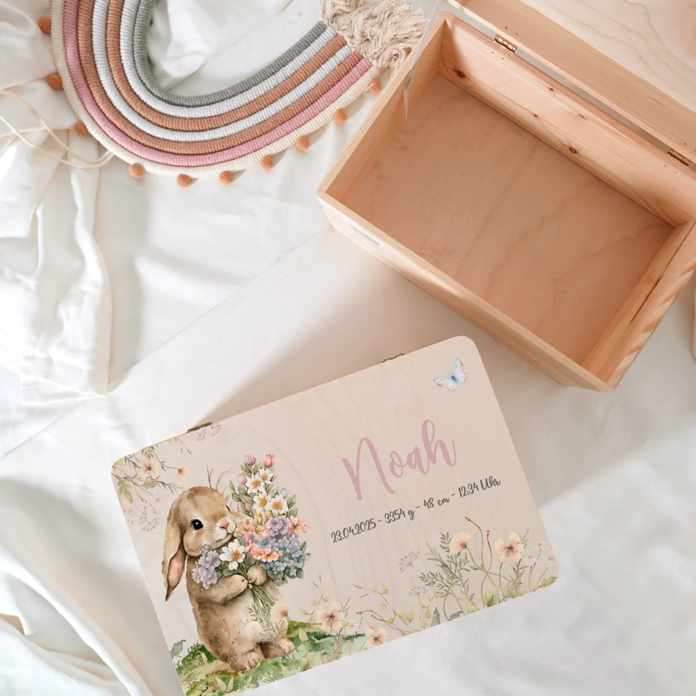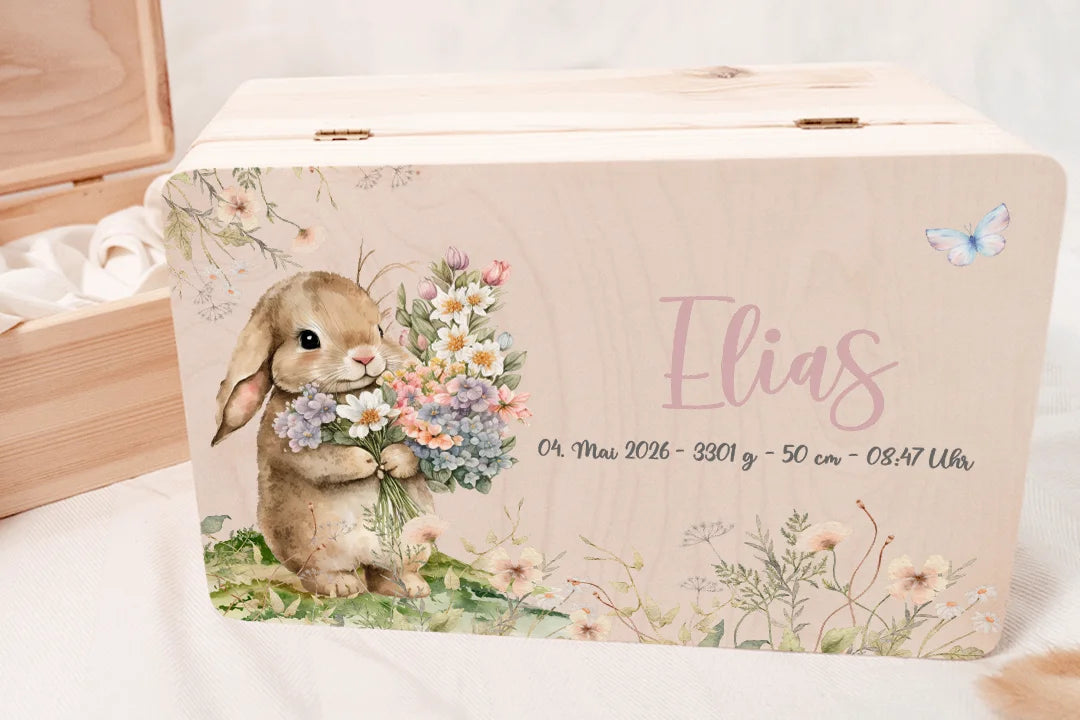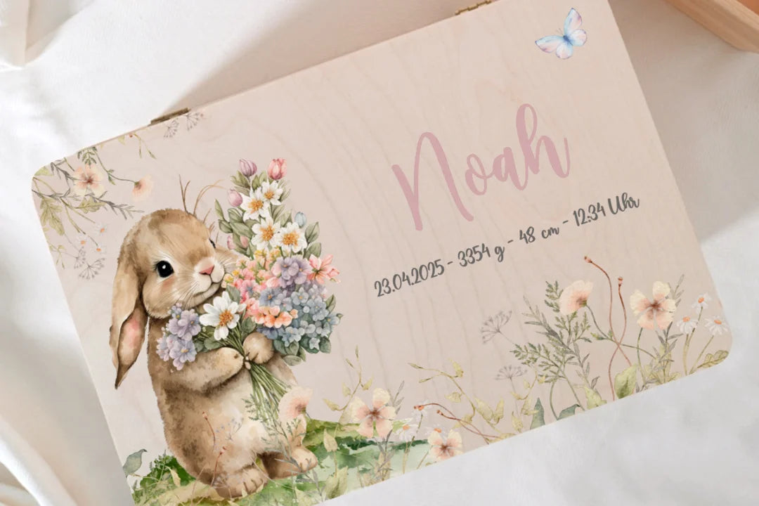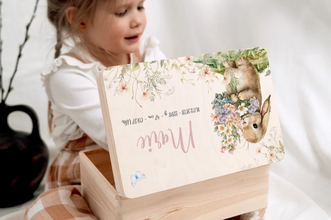 Liebevolle Holzkiste mit Namen und Geburtsdaten – perfekt für die ersten Erinnerungen deines Babys.