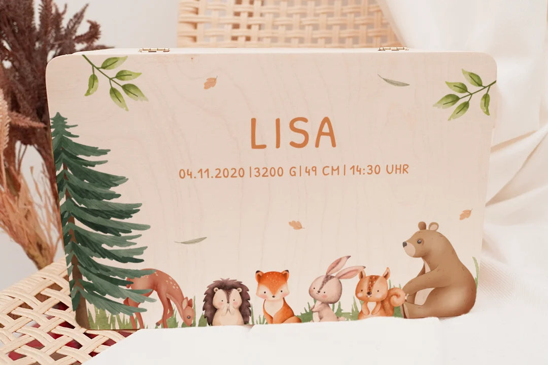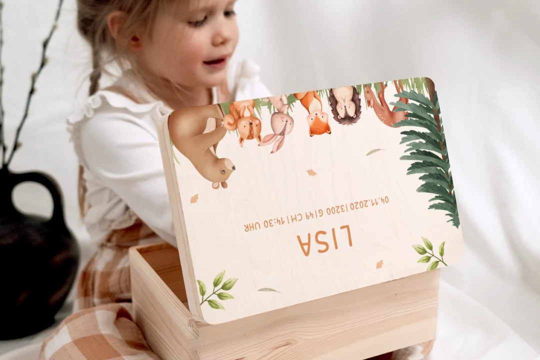 Liebevoll gestaltete Holzkiste für die ersten Erinnerungen – mit Namen und Geburtsdaten personalisierbar.