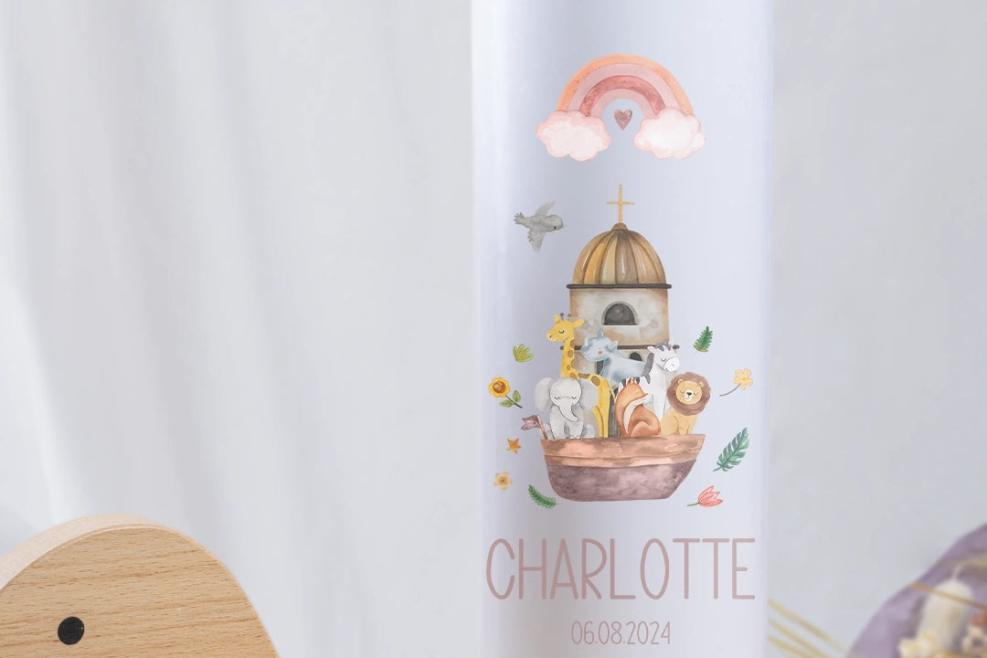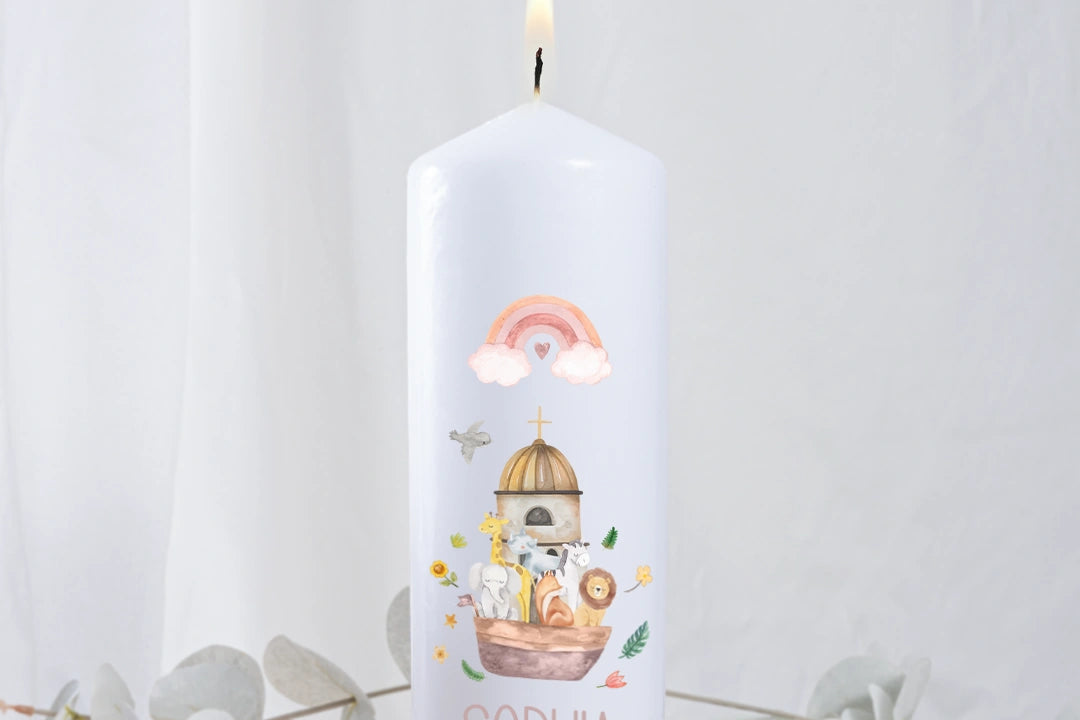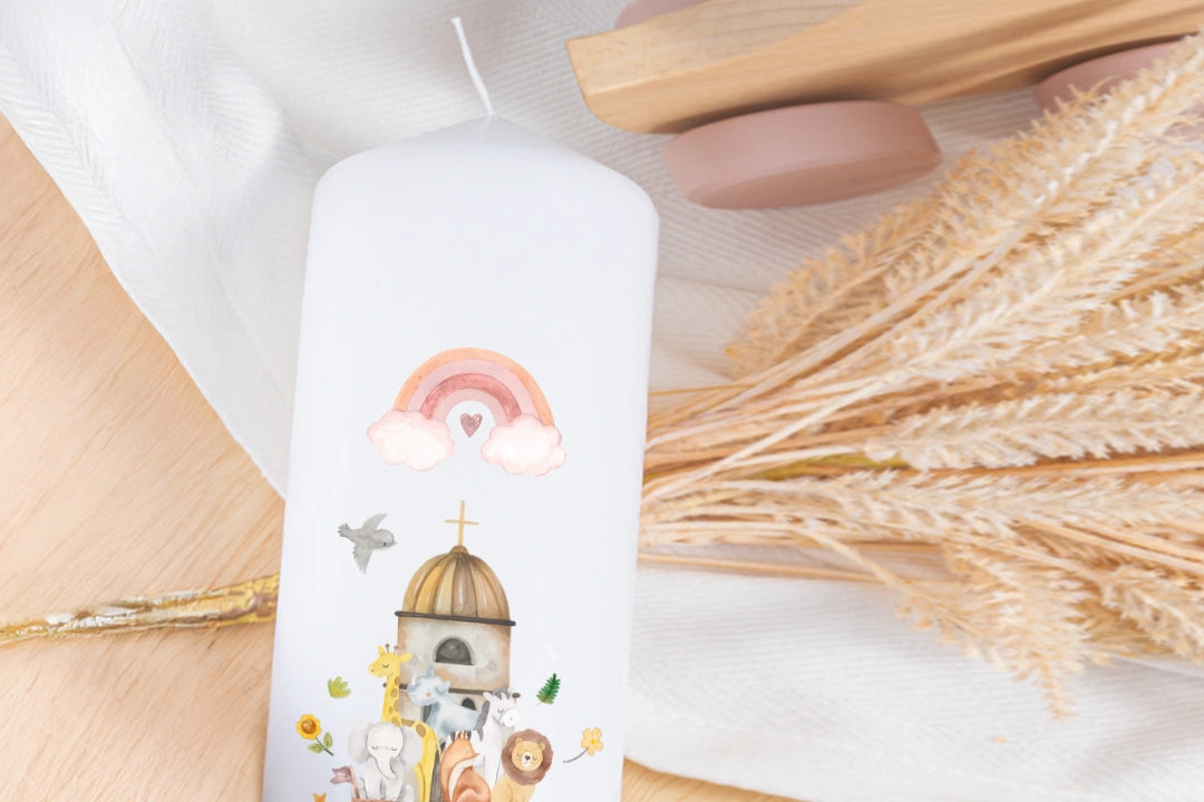 Liebevoll gestaltete Kerze für die Taufe – mit Namen, Datum und Segensspruch personalisierbar.