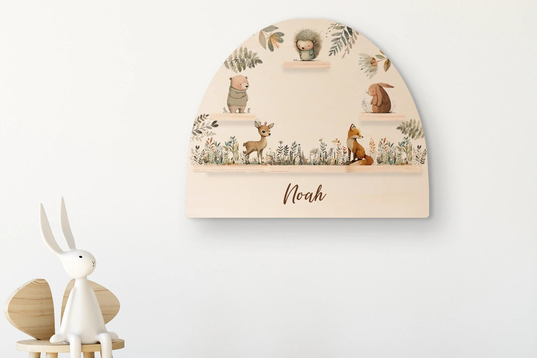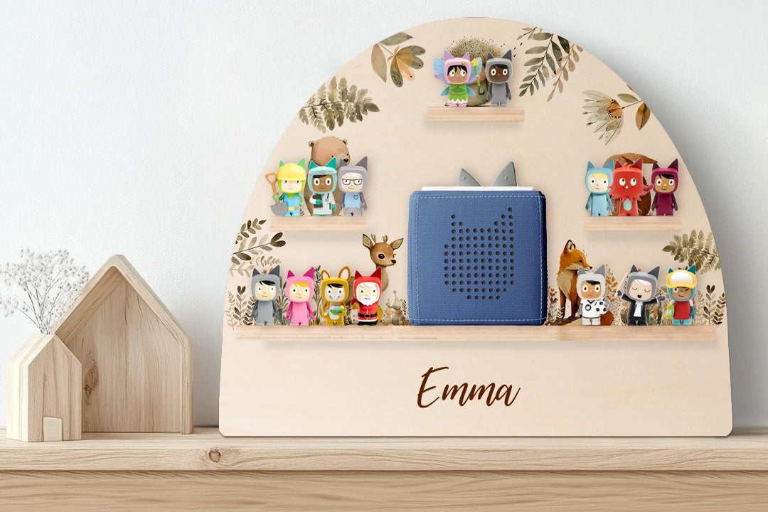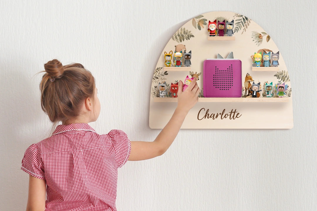Wunderschönes Wandregal für Toniebox und Figuren – mit liebevollen Waldtieren im Aquarellstil und deinem Wunschnamen
