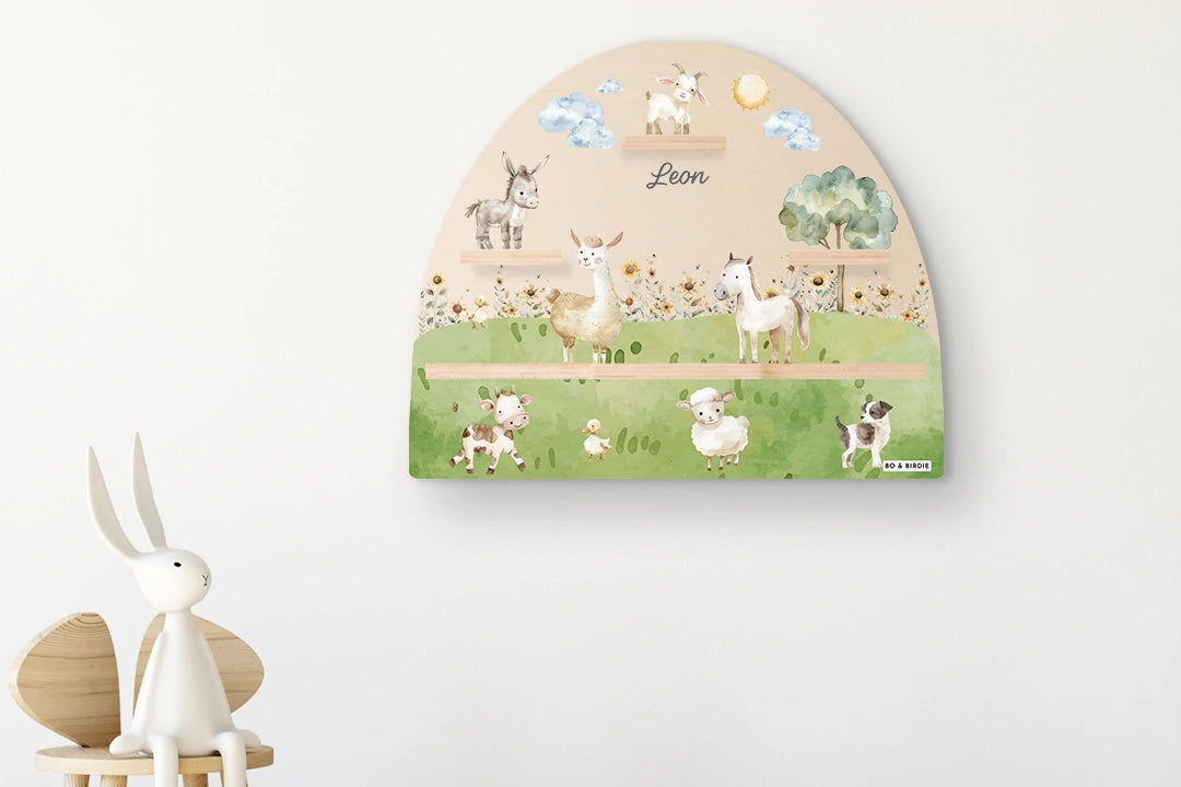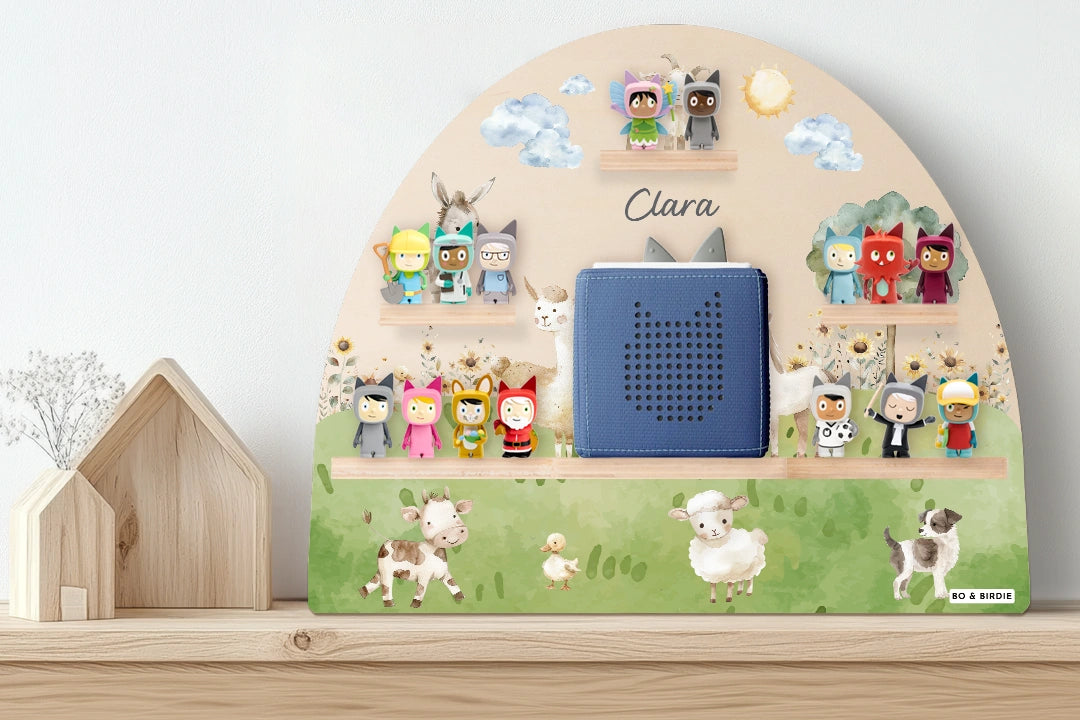 Liebevoll gestaltetes Regal im fröhlichen Bauernhof-Design für Toniebox und Figuren