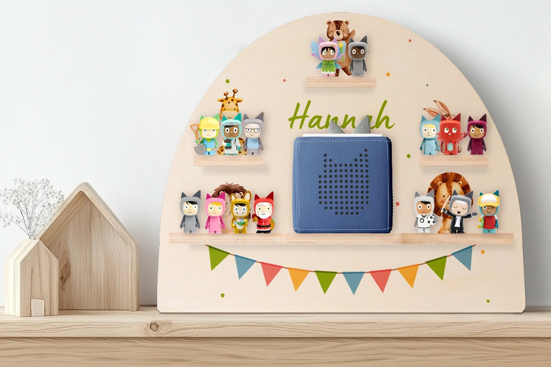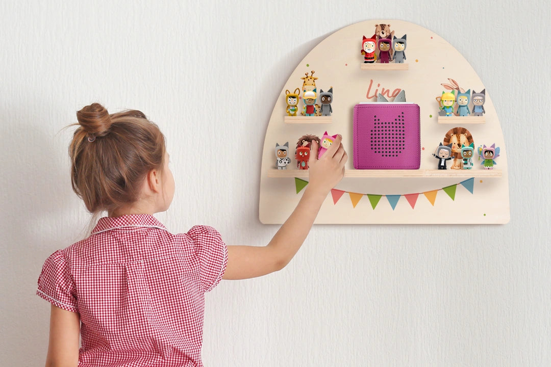 Das Regal wird aus robustem Pappelholz gefertigt – stabil, langlebig und umweltfreundlich. Außerdem sind in der Ablage für die Tonie-Figuren Magentleisten verarbeitet, um die Figuren sicher abstellen zu können.