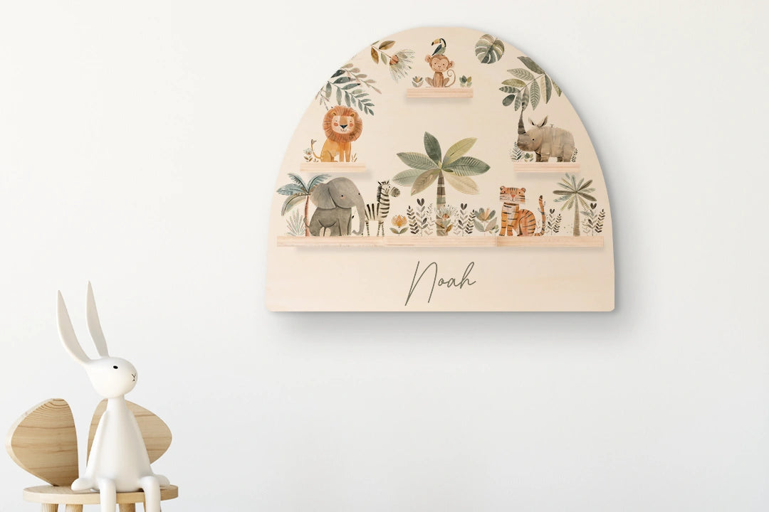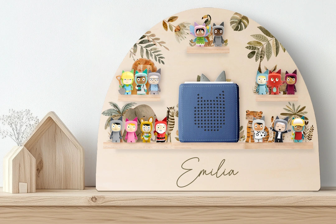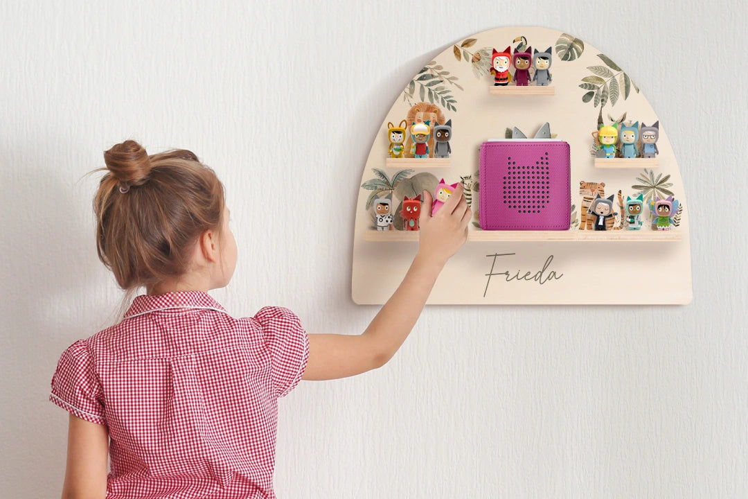 Liebevoll gestaltetes Wandregal mit Tiermotiven – ideal zur Aufbewahrung der Toniebox und Figuren