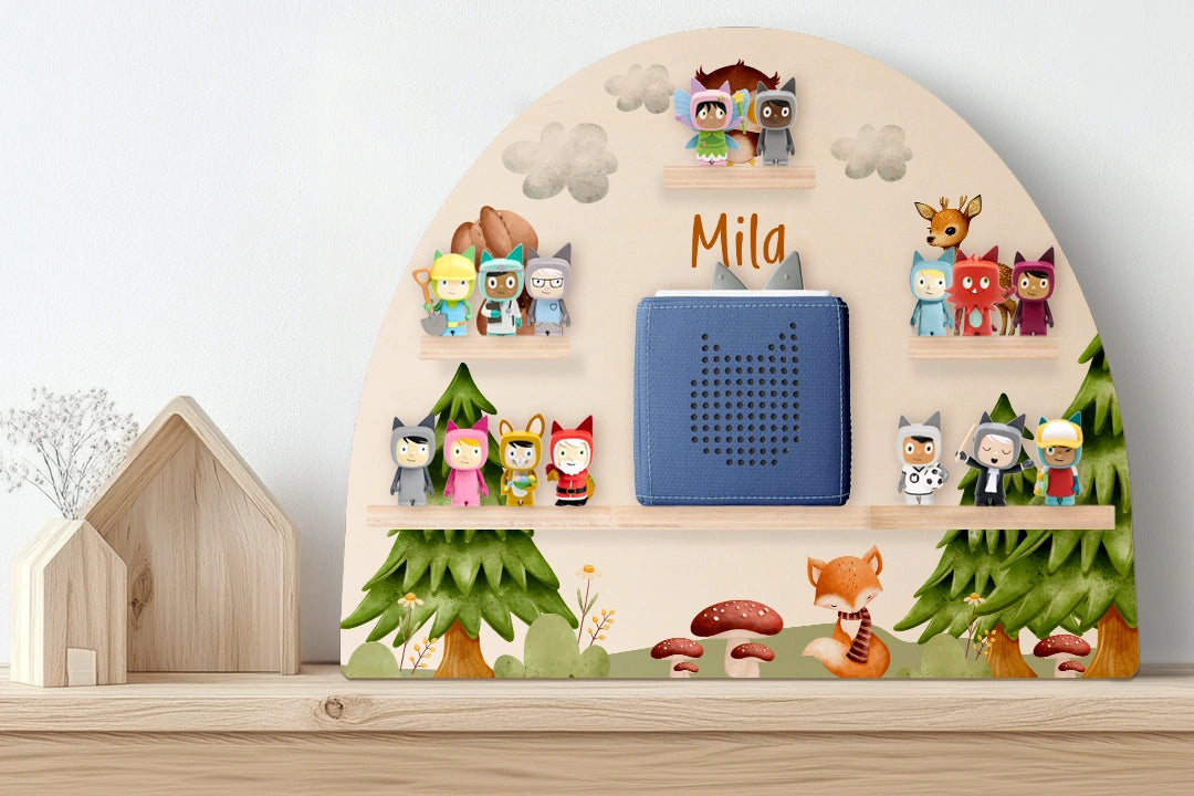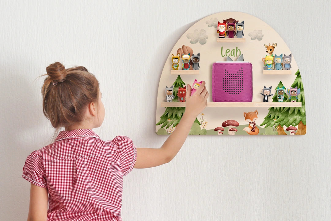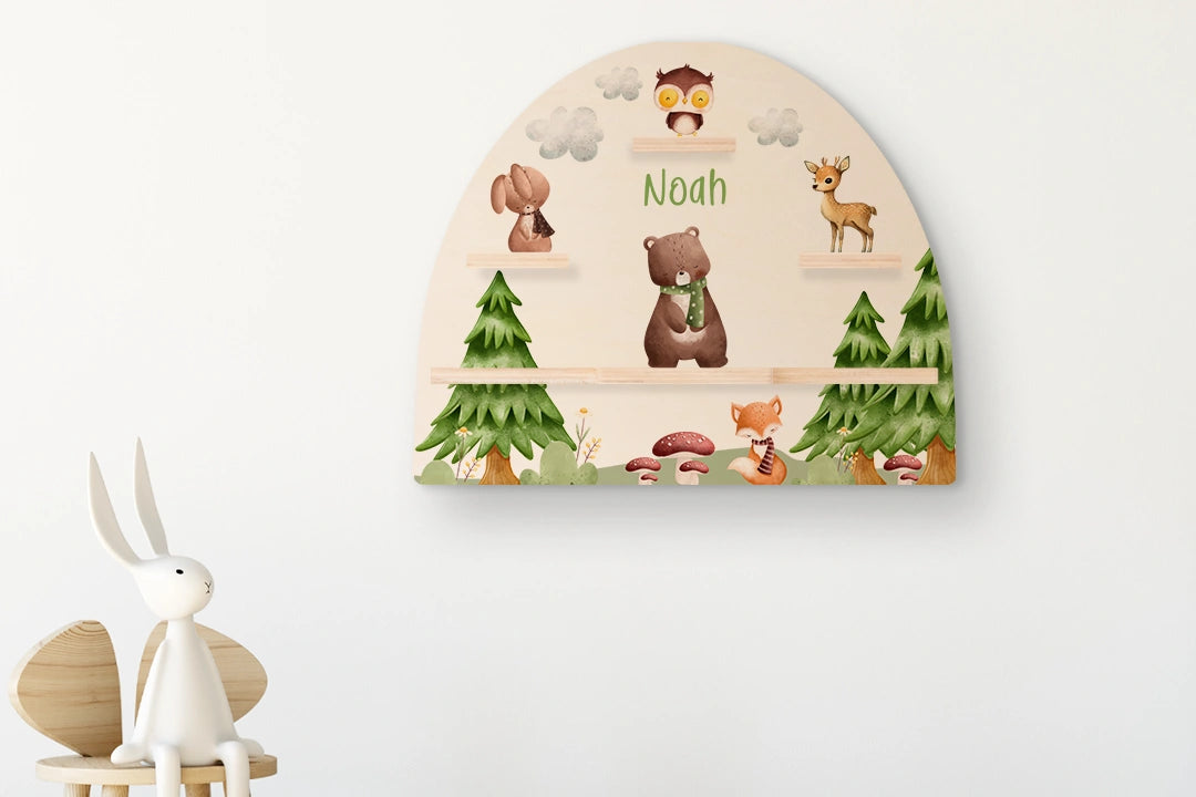 Liebevoll gestaltetes Regal mit Waldbewohnern – personalisierbar mit deinem Wunschnamen